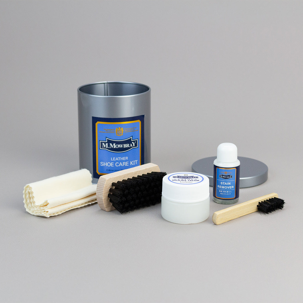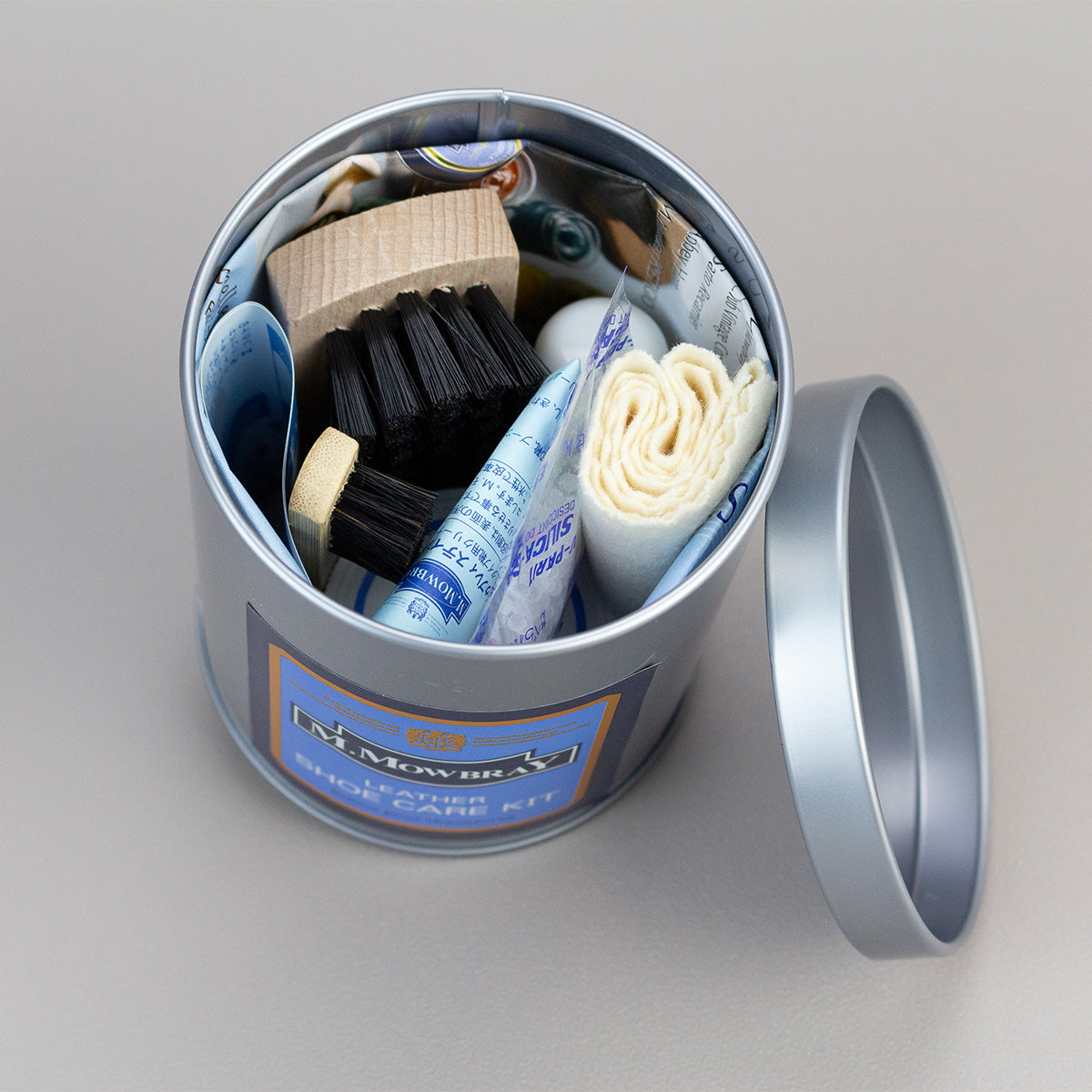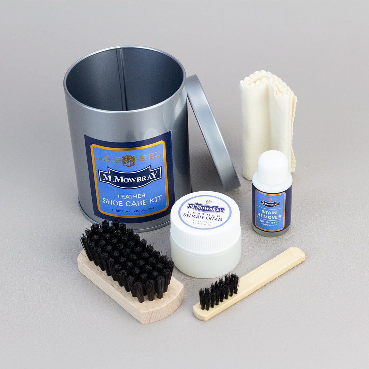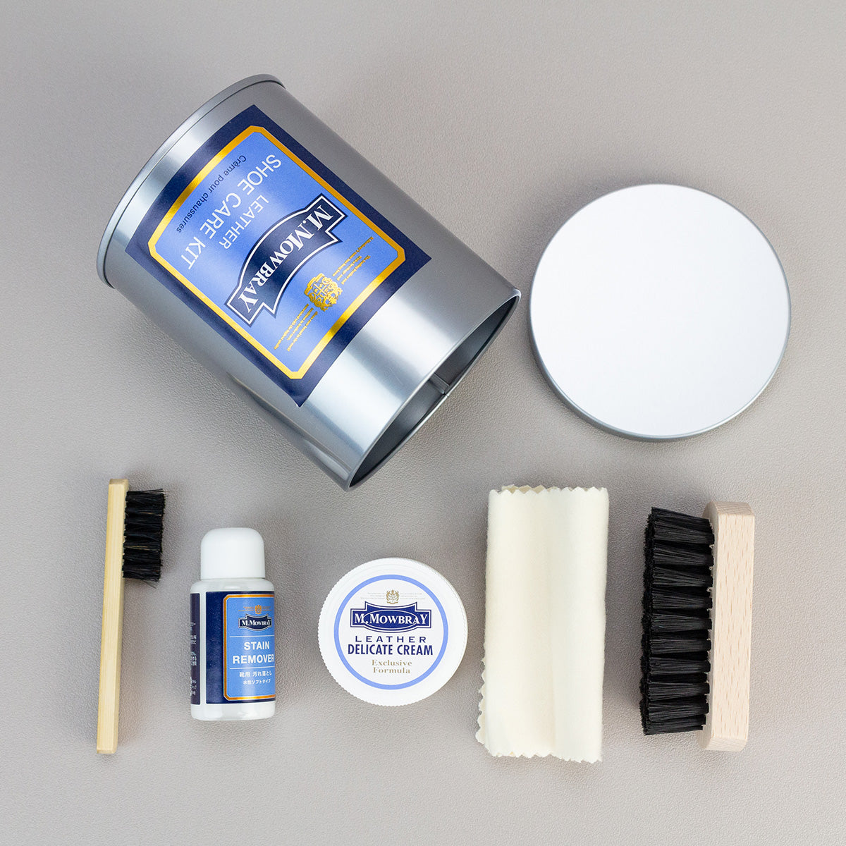 1.M.モゥブレイのオリジナル缶に入ったスムース皮革用簡易シューケアセットです。 2.ステインリムーバーと保湿効果の高いデリケートクリーム、クロスとブラシがセットになっていますので靴のお手入れの基本はこの一缶で可能です。 3.- |
