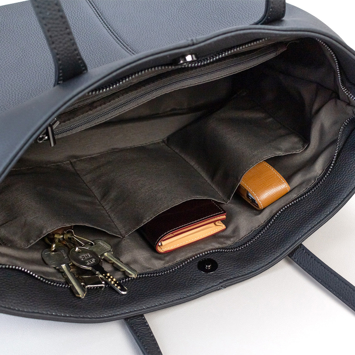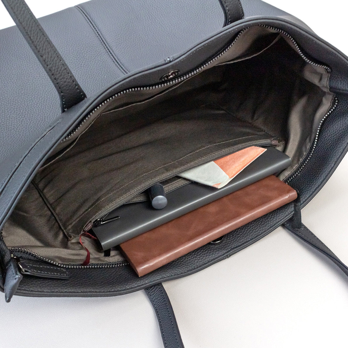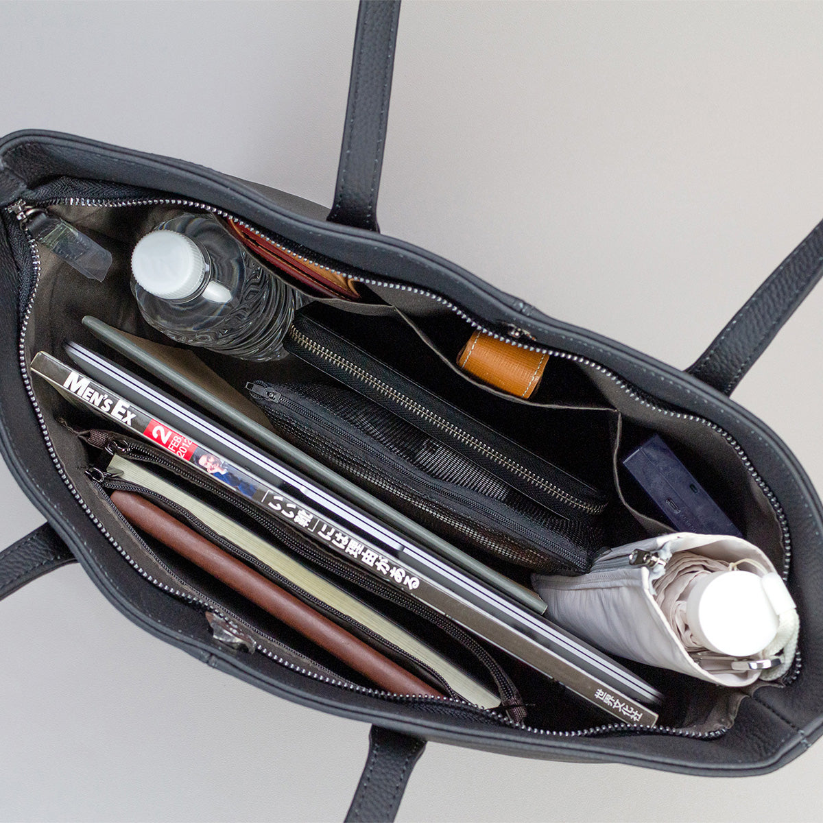 総容量もお仕事や、日常づかいに十分で、13インチのノートPC、書類、ペンケース、スマホ、小物類を整理しながら収納でき、必要なものにすぐアクセスできます。