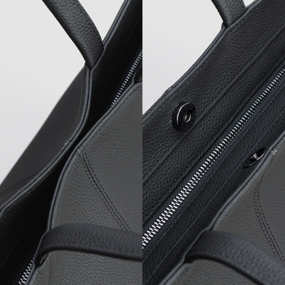 持ち手の付け根を内側に隠し、デザイン性を極力抑える(削ぎ落とす)ことで本革の質感が映えるバッグに仕上がりました。